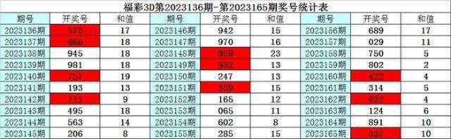 上期回顾:福彩3D第2023165期奖号为:337,其中奖号组选类型为:组三,奇偶比为3:0,大小比为1:2,012路比为2:1:0,和值为13,跨度为4。