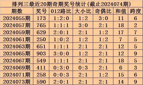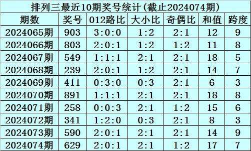上期回顾:排列三2024074期奖号为629,奇偶比为1:2,大小比为2:1,跨度为17。