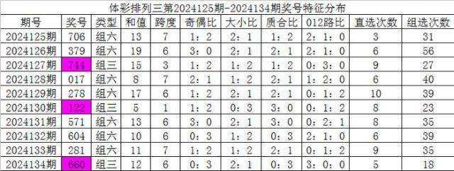 开奖公告:体彩排列三第2024134期开出奖号:660。组三,无重号,奇偶比0:3,大小比2:1,012比3:0:0,和值12,跨度6。