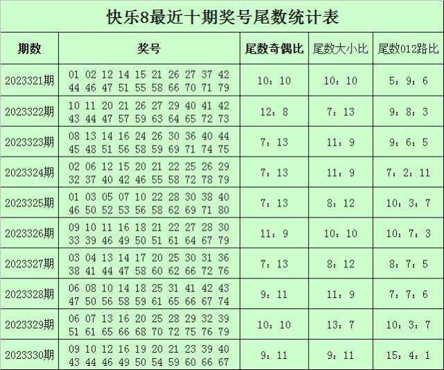 福彩快乐8第2023330期开奖回顾:09 10 12 16 19 20 21 23 39 40 43 44 46 49 50 54 59 60 66 67,其中奖号尾数012路比为15:4:1,尾数大小比为9:11,奇偶比为9:11。