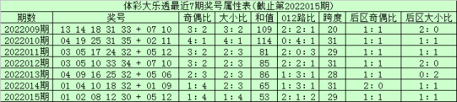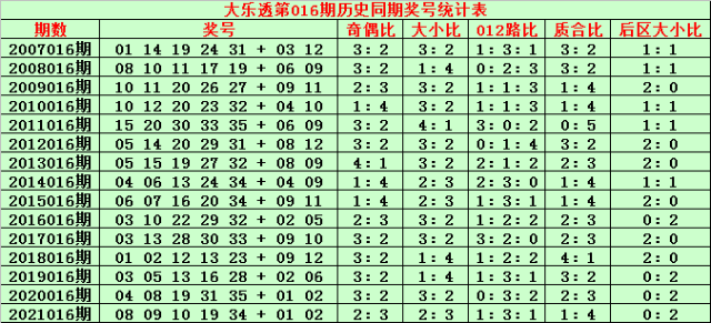 3、在历史同期第016期开奖中,前区号码大小总比例为37:38,大小号码开出比例基本相当,本期看好大号走热,大小比关注3:2;