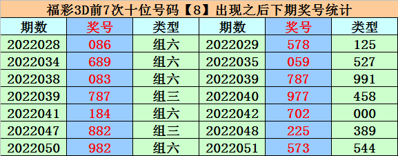 在十位开奖中,号码8前7次出现之后,下期奖号分别为:7、5、8、7、0、2、7,其中奖号奇偶比为4:3,大小比为5:2,012路比为1:3:3。