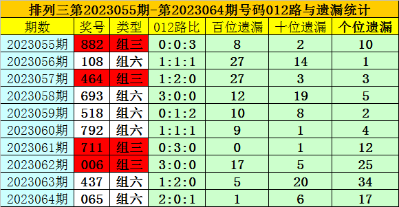 开奖回顾:排列三第2023064期奖号为:065,类型为组六,号码012路比为2:0:1,百十个位号码直选分别遗漏1期、6期和17期。