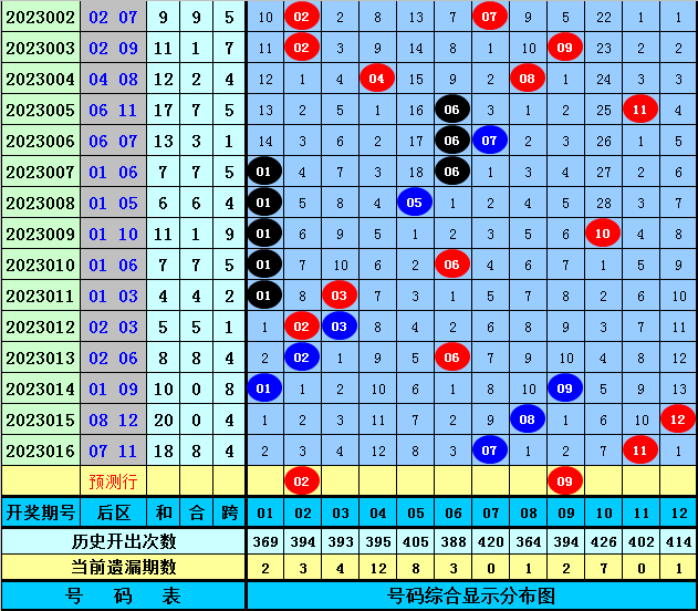 前第二区(13-23):上期没有出号,走冷断区,该区最近10期断区2次,共出现13个奖号,本期看好前第二区号码回补转热,预计出号3个。