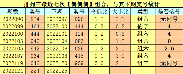 奇偶分析:排列三上期奖号为224,其奇偶类型为【偶偶偶】,最近七次出现奇偶类型偶偶偶的号码分别为:824、464、444、046、642、064、046,其下期奖号分别为:824、464、444、046、642、064、046。其中号码奇偶比为9:12,奇偶奖号开出比例基本平衡,本期看好偶数号码转热,注意奇偶比1:2出现。