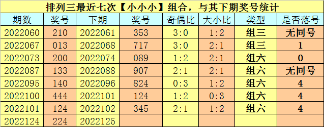奖号类型分析:排列三最近七次【小小小】组合与【偶偶偶】组合出现之后,其下期豹子号码开出1次,组三号码开出3次,组六号码开出10次,其中组六号码开出频率非常热,本期预计继续开出组六号码。另外,其下期有4期没有出现重号,本期不看好开出重号。