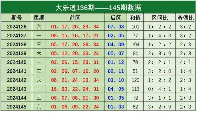 大乐透第2024145期出奖号统计:前区01、06、09、22、24,后区01、03。和值为62,区间比为3:2:0,奇偶比为2:3。