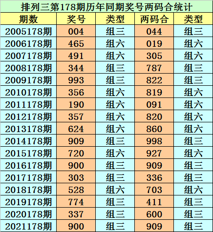 排列三从2004年开奖至今已开出6247期奖号了,其中第178期历史同期奖号出现17次,历年第178期分别开出号码:004、465、491、344、993、356、190、357、624、909、720、900、303、528、774、337、900。