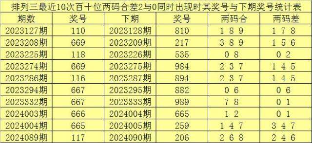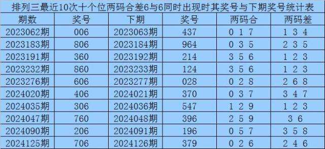 百个位合差分析:上期奖号百个位开出60组合,两码合为6,两码差为6,最近10次百个位两码合6与两码差6同时出现时,其奖号和下期奖号分别为: