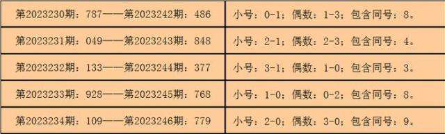 所以,3D第2023235期开出奖号:480,其大小比为1:2,奇偶比为0:3,012路比为1:1:1,与3D第2023247期奖号可能有同号。