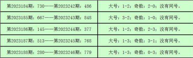 则,3D第2023189期开出奖号:327,其大小比为1:2,奇偶比为2:1,012路比为1:1:1,与3D第2023247期奖号可能没有同号。