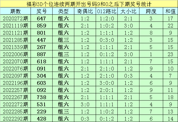 个位号码:最近两期个位开出号码为9-0,在福彩3D历史开奖中,前后两期个位分别开出号码9-0的奖号出现了99次。最近15期个位9-0组合出现之后,其下期奖号分别为:647-859-801-447-267-887-618-091-304-603-092-738-531-229-428;
