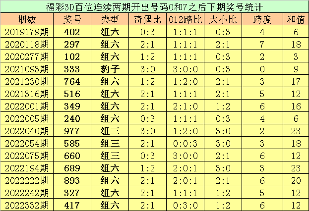 百位号码:连续两期百位出号分别为:0-7,历史上福彩3D连续两期前后分别出号0-7的奖号共出现70次。在百位0-7的奖号现象出现时,近15期下期分别出号:402-297-102-333-764-516-349-240-977-585-660-689-893-327-417;