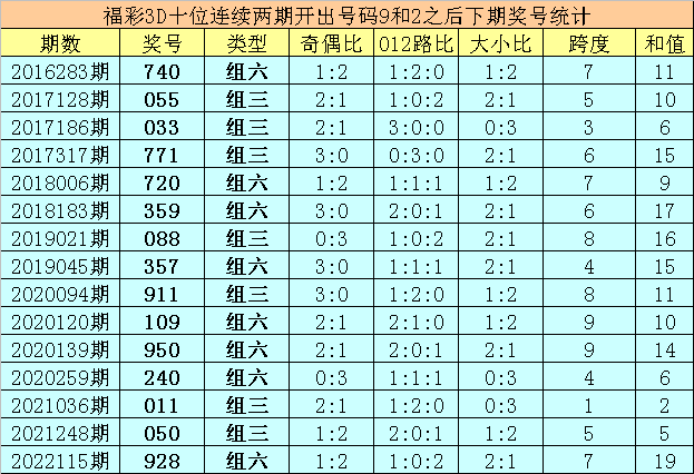 十位号码:前两期十位分别出现奖号9-2,历史上福彩3D连续前后分别开出号码9-2的现象共开出60次。在十位9-2的现象出现时,最近15期其下期分别开出号码:740-055-033-771-720-359-088-357-911-109-950-240-011-050-928;