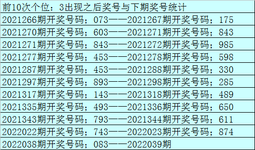 上期回顾:福利彩票3D第2022038期开奖结果:奖号为083,奖号和值为:11,奖号跨度为:8,奇偶形态为:偶偶奇,大小形态为:小大小。