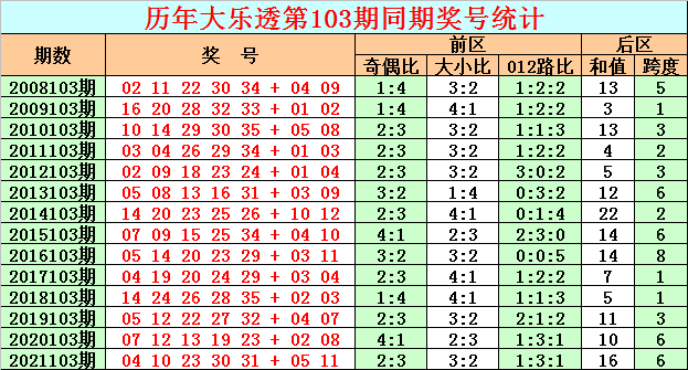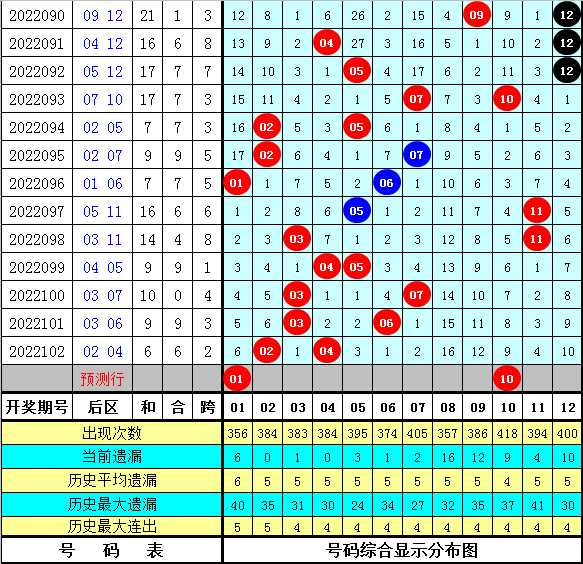 在历史同期开奖中,后区号码和值奇偶为7:7,基本持平,本期看好奇号和值出现,参考和值11。