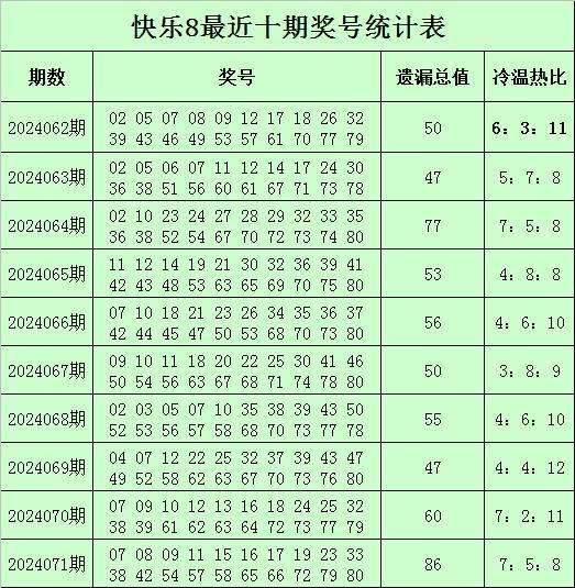 福彩快乐8第2024071期开奖回顾:07 08 09 11 15 16 17 19 23 33 38 42 54 57 58 65 66 72 79 80,其中冷温热码比为4:7:9,遗漏总值为86。