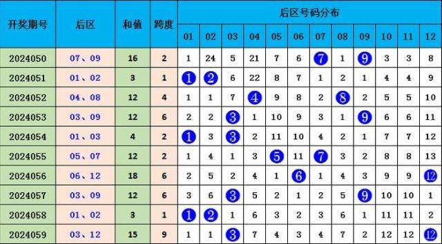 后区上期开出奖号03和12,为奇偶组合。近5期后区奇偶比为6:4,大小比为4:6。本期预计小大、奇偶组合热出,参考两码:05 10。