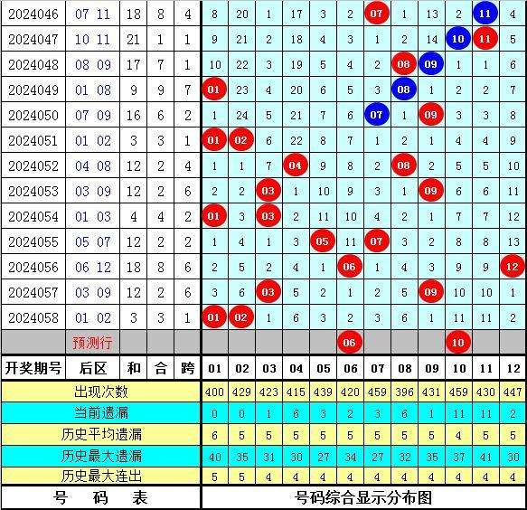 上期回顾:大乐透第2024058期开出奖号:06 10 13 20 32 + 01 02,前区包含4个尾数:0、2、3、6,后区开出一奇一偶、全小组合。