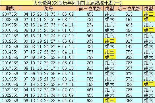 在大乐透第059期历年同期奖号中,前区后三位尾数出号频次分别为:尾数5、7出现8个,尾数3出现7个,尾数1、4出现6个,尾数2、8、9出现5个,尾数0出现1个,尾数6没有出现。其中尾数数字三类型豹子、组三、组六次数比为0:4:13,今年同期后三位尾数类型参考组六;
