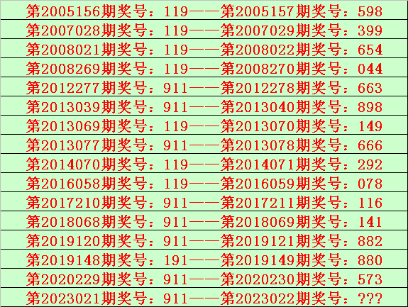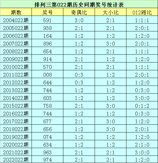 排列三第2023022期开奖日期:2023年2月1日,历史上第022期已开出了19次奖号,历年同期号码分别为:591、938、164、896、654、914、570、008、644、744、603、758、744、677、656、074、634、963、974。