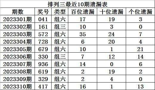 上期回顾:排列三第2023310期奖号:417,组六,直选遗漏总值为30期。