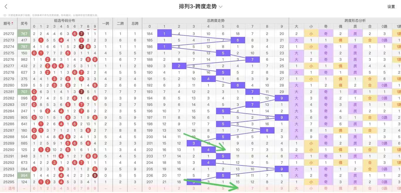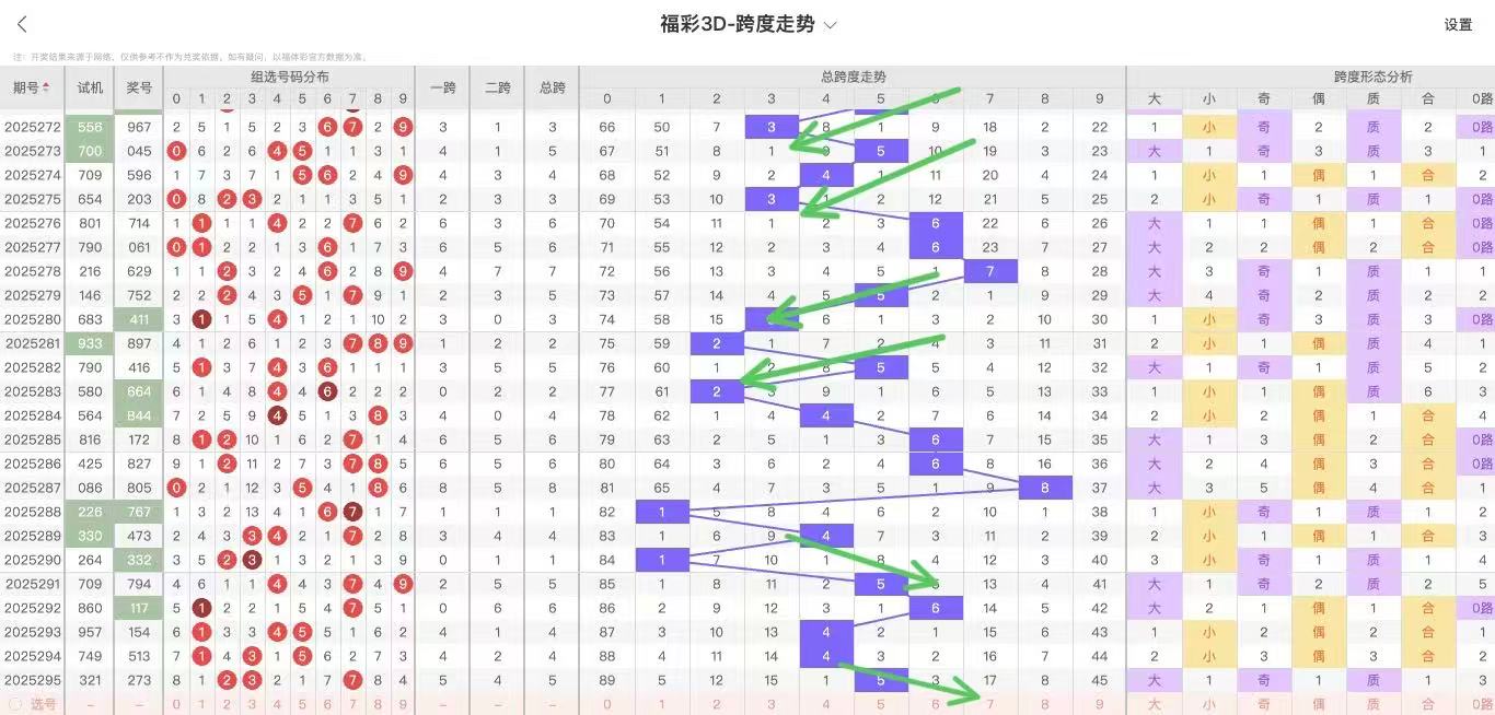 10期内跨度走势为:5-8-5-3-4-5-4-9-5-3,10期内大小跨比:6:4,奇偶跨比7:3,百期内跨度3共开出的13次,下期数据:6 4 6 2 7 5 6 7 9 2 8 4 近期度较热,考虑跨度3开出后容易出大跨度,近期大小规律下大:偶:合,所以接下来继续大跨,偶跨度表现!