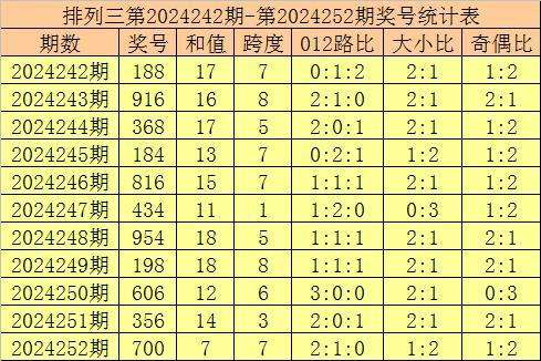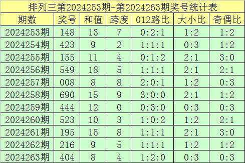 开奖回顾:排列三第2024263期奖号开出:404,组选类型:组三,大小比为0:3,奇偶比为0:3,和值为8,跨度为4。