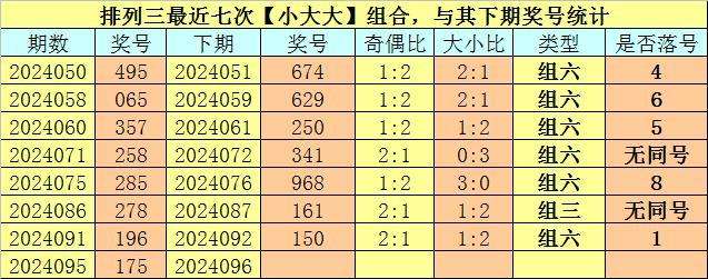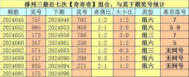 奖号类型分析:排列三最近七次【小大大】组合与【奇奇奇】组合出现之后,其下期组三号码开出3次,组六号码开出11次,其中组六号码开出频率非常热,本期预计继续开出组六号码。另外,其下期有5期没有出现重号,本期不看好开出重号。