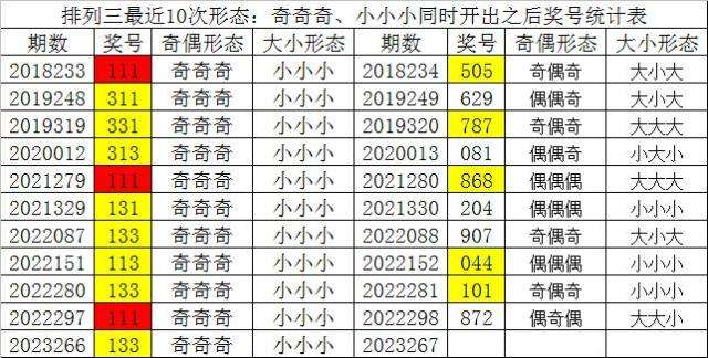 排列三最近10次同时开出奇偶形态:奇奇奇和大小形态:小小小时其奖号分别为:111-311-331-313-111-131-133-113-133-111-133,下期分别开出号码为:505-629-787-081-868-204-907-044-101-872,详细统计见下表: