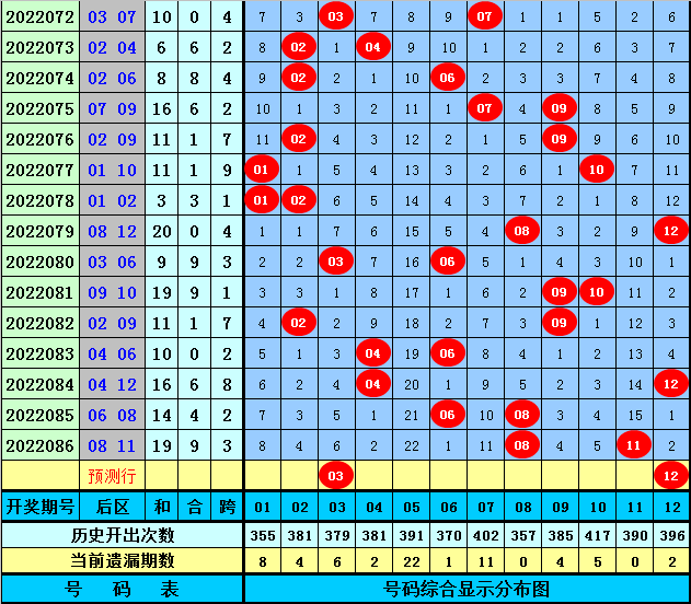 后区分析:上期后区开出第二区和三区号码08+08,最近10期后区三区落号比为1:0:1,最近5期后区三区落号比为1:0:1,本期后区号码大范围关注02、03、07、10、12,后区精选两码03、12。