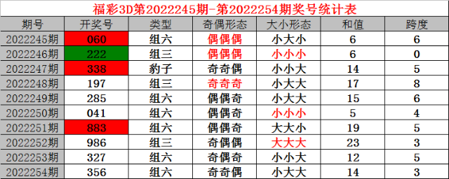 上期回顾:福利彩票3D第2022254期开奖结果356。奖号:奇奇偶、小大大,和值14,跨度3。