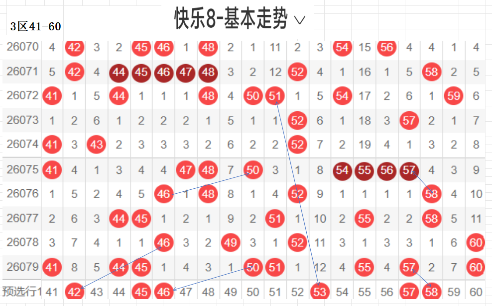 三区(41-60):遗漏5期以下有17码,0码41 44 45 50 51 55 57 60 8个,温开方式,这区码数有回暖之意,可以防一手,先定胆码走势较大者,隔期,斜三连,分边号码,可重防,间隔5期以上号码可以随走势选取,例如本期大冷码,走势比较大,可以做胆,通常联动可带出,分边对称的号码,本区间也有很大走势.可关注下.隐形夹角号码.做补位形态号码.都需要观察动态走势.以上是本区间的选码方法.