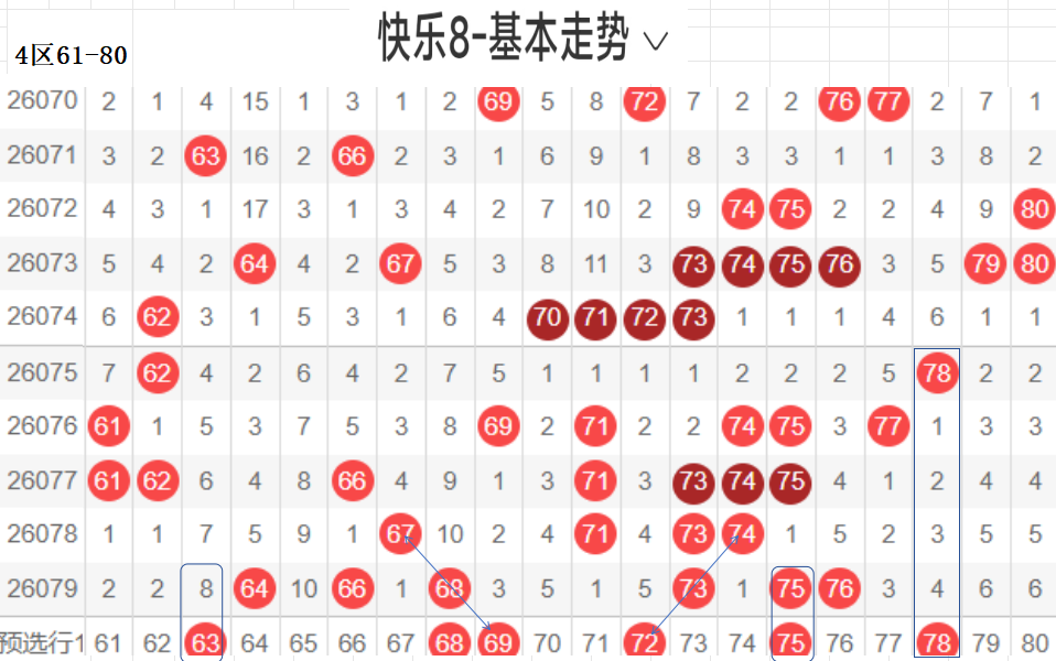 四区:(61-80):遗漏5期(含5)以下有16码,0码64 66 68 73 75 76 6个,平均温开方式,上期开出6码,区间回暖,后区可防,四区间从以往数据来看,重码很强,一枝独秀的存在,近期有回补走热的趋势,区间回暖后,本区间后区可防,与一区相比,也是温区.,对称下落码,隔期回补码,可以防守,这区对呈对称三角关系的胆码,斜三连有走势的胆码,联动落位码,都有各自的走向落位关系,根据走势选择一种方式选码.