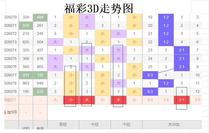 2:如图所示,上期0大3小走势.个位的走势出1小,十位出3小,百位出3小.比例为0:3.本期给出的推测是2大1小.个位大码:56789.十位大码:56789,百位小码:01234.这是给出的范围.下面通过其他走势缩小范围.
