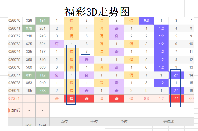 3:如图所示数据,上期开出2奇1偶,个位为奇,开2期.十位为奇,开1期.百位为偶,开2期.比例2:1.本期推测2奇1偶,个位为奇,13579.十位为奇,13579,百位为偶,02468.结合下大小分析进行缩小