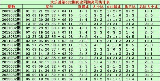 2、在历史同期第032期开奖中,前区号码奇偶总比例为47:38,奇数号码明显表现活跃,本期预计奇数号码继续走热,看好奇偶比3:2出现;