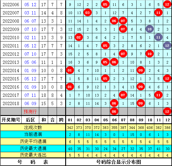 后区分析:后区上期开出号码06+09,和值为15,跨度为3。最近10区后一区(01-06)开出8个号码,断区3次,后二区(07-12)开出12个号码,断区1次,本期后一区注意号码:02、04、06;后二区注意号码:07、08、12。