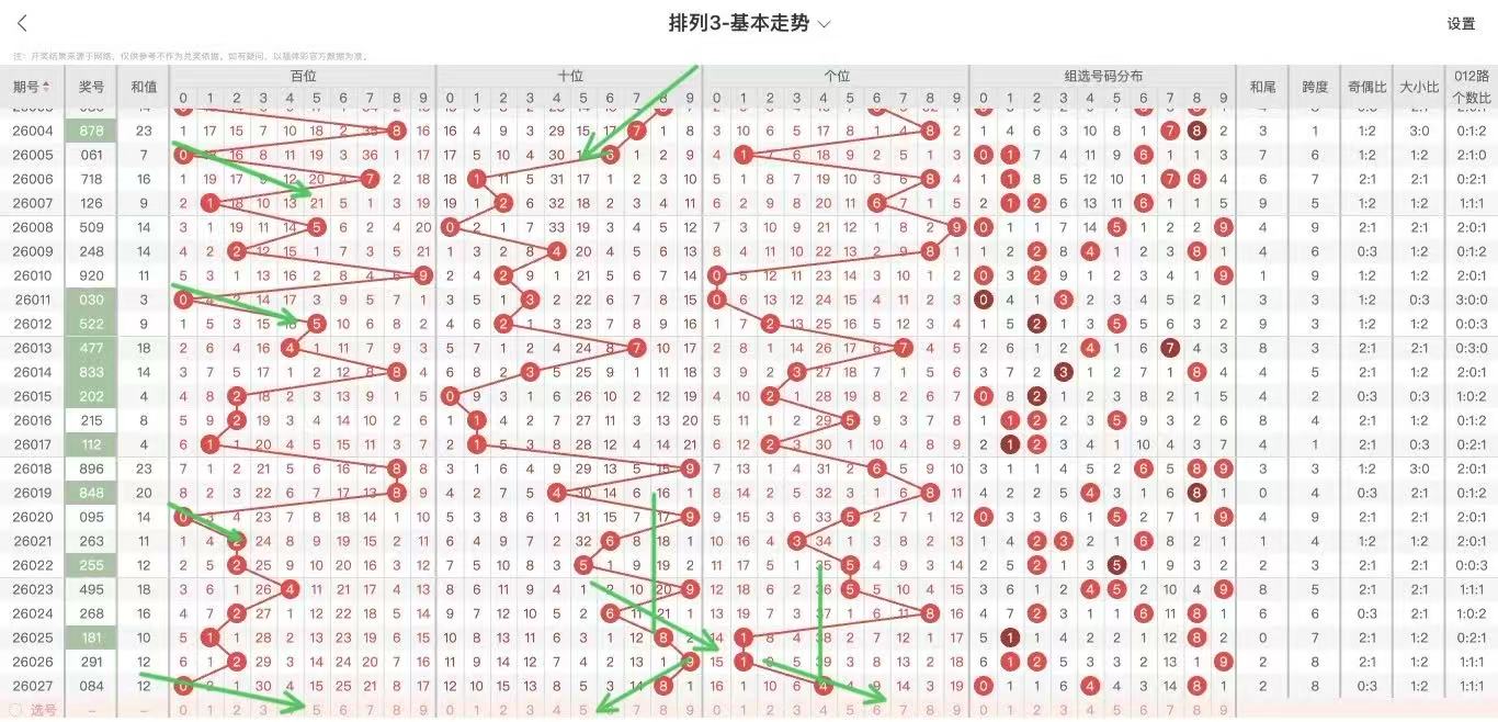 个位:上期冷号4,目前个位遗漏最多的号码是9共遗漏19期已入冷号位,而近百期4号在个位共开出10期,下期数据: 5 4 4 2 7 9 0 4 0近十期个位走势: 8 8 3 5 5 8 1 1 4其中偶数占比百分之四十,大数占比百分之五十,4开出后更容易小号,所以本期个位预计看好开出大,范围:23567