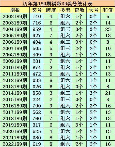 历年第189期福彩3D同期奖号为:140 - 716 - 959 - 927 - 404 - 505 - 409 - 281 - 674 - 472 - 083 - 026 - 858 - 224 - 790 - 562 - 760 - 317 - 625 - 380 - 619。
