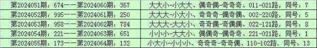 则,排列三第2024056期奖号:788,与排列三第2024065期奖号可能有相同的号码。且排列三第2024065期奖号大小比、奇偶比和012路比可以参考第2024056期奖号形态:大大大、奇偶偶和122路。