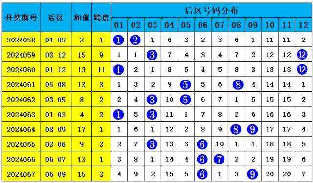 后区上期开出号码06、09,奇偶比为1:1,近十期后区奇偶比为12:8,总体看奇走势较热,本期后区要注意奇偶比:1:1,五码复式参考02 05 09 10 12,重点两码推荐:05、10