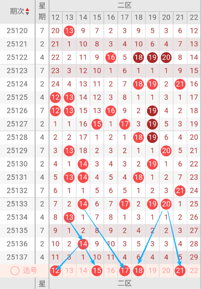 根据走势图可以看出当前区段,127期开出15.17.19三个号码球 ,128期开出18.19二个号码球 ,129期开出13.20二个号码球 ,130期开出14.19二个号码球 ,132期开出21一个号码球 ,133期开出14.17.19.20四个号码球 ,134期开出13一个号码球 ,135期没有开出号码球 ,136期开出14一个号码球 ,137期没有开出号码球 ,按照如此规律本期当前区可能开出2单或1单。我们看下当前区上期没有开出重叠号,那么本期当前区要定重叠号的情况下可关注14号码球。再看下当前区上期没有开出斜连号,当期选号得留意斜连15号码球。本区重点关注12.15.17.18.21