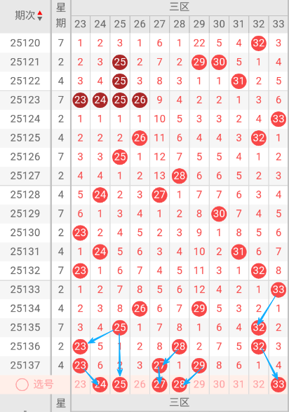 根据走势图可以看出当前区,127期开出28一个号码球 ,128期开出24.27二个号码球 ,129期开出30一个号码球 ,130期开出23一个号码球 ,132期开出23.32二个号码球 ,133期开出33一个号码球 ,134期开出个26.29二号码球 ,135期开出25.32二个号码球 ,136期开出23.28.32三个号码球 ,137期开出23.27.29三个号码球 ,按照如此规律判断本期当前区可能开出2单或1单1双。我们看下当前区上期开出23重叠号,那么本期当前区要定重叠号的情况下可关注27码球。再看下当前区上期没有开出斜连号,当期选号得留意24斜连号。本区重点关注24.25.27.28.33