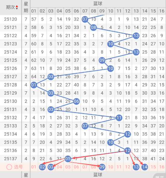 根据走势图近10期的走势看,蓝球在126期开出10蓝球之后,5小1大1小3大,再看下近10期的蓝球中冷码有回补的趋势,这种趋势规律本期判断极有可能开出大号,本期防蓝球11大号,蓝球本期重点关注02,03,09,13,14