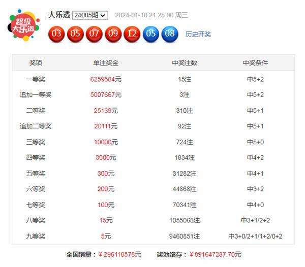 大乐透第2024005期开出奖号:03 05 07 09 12 + 05 08。其中前区三区比为5:0:0,和值为36,奇偶比为4:1,跨度为9,后区全部落在第二区中。