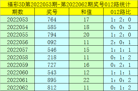 上期回顾:福彩3D第2022062期开出奖号:812。奖号为组六形态,与试机号没有同,奇偶比为1:2,大小比为1:2,012路比为0:1:2,和值为11,跨度为7。