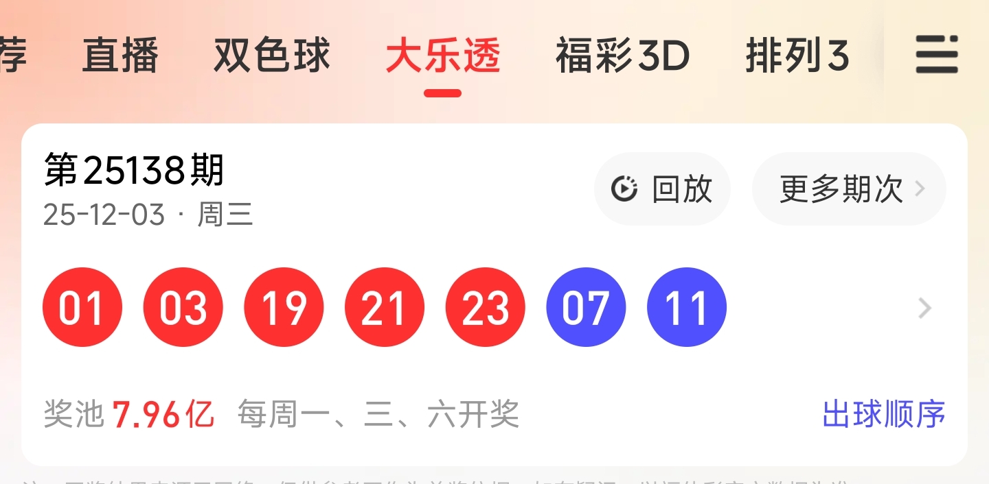 第25138期大乐透文章推荐中命中3,19,23等3个红球,蓝球7。