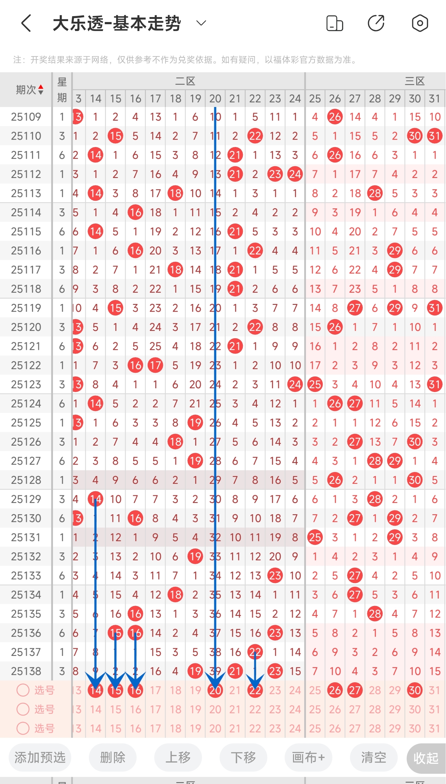 上一期开出了19,21,23号球,往前一期开出了22号球。通过分析走势图,可以看到上期号码开了中间的号码,从二区整体开号走势来看,最近号码有慢慢回补的趋势,特别是右边,回补趋势明显,本期重点关注,其次是防左边号码又开出。最后再结合遗漏情况和冷热号,本期我们可以关注14,15,16,20,22等号。综上所述我们可以推测本期可能会开出有14,15,16,20,22等号码。