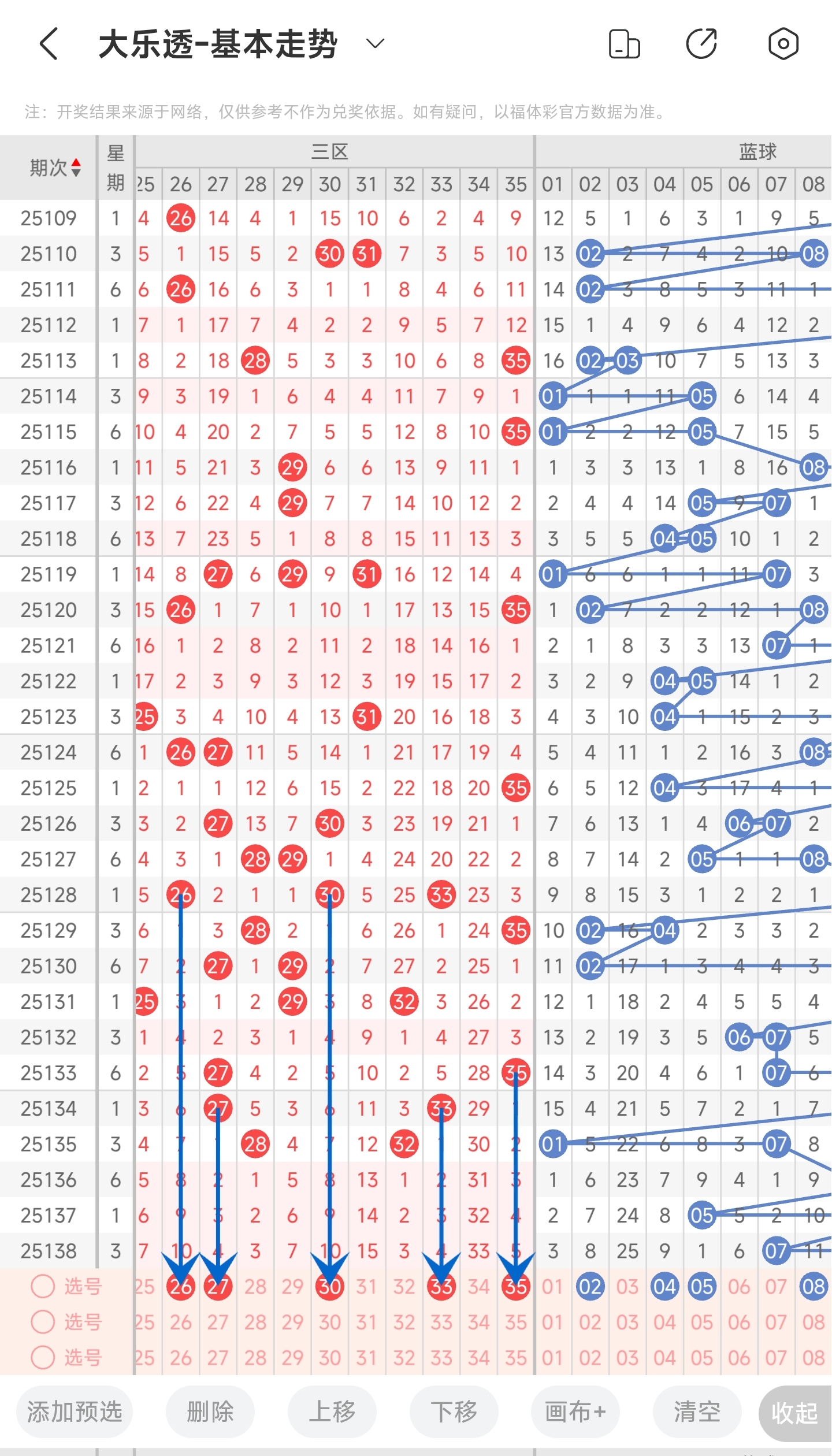 上期没有开出号码,往前一期没有开出号码。通过分析走势图,可以看到上期没有开出号码,连续3期都没有开出号码,这是很少见的,一般来说,断区2期就大概率会有号码回补的,但上期也是没有开出号码,推测本期很大概率会有号码回补,保底开1码,或者开更多。所以本期我们均匀关注一下三区的号码。最后再结合冷热号和遗漏期数,本期我们可以关注26,27,30,33,35等号。综上所述本期三区我们推测可能会开26,27,30,33,35等号码。